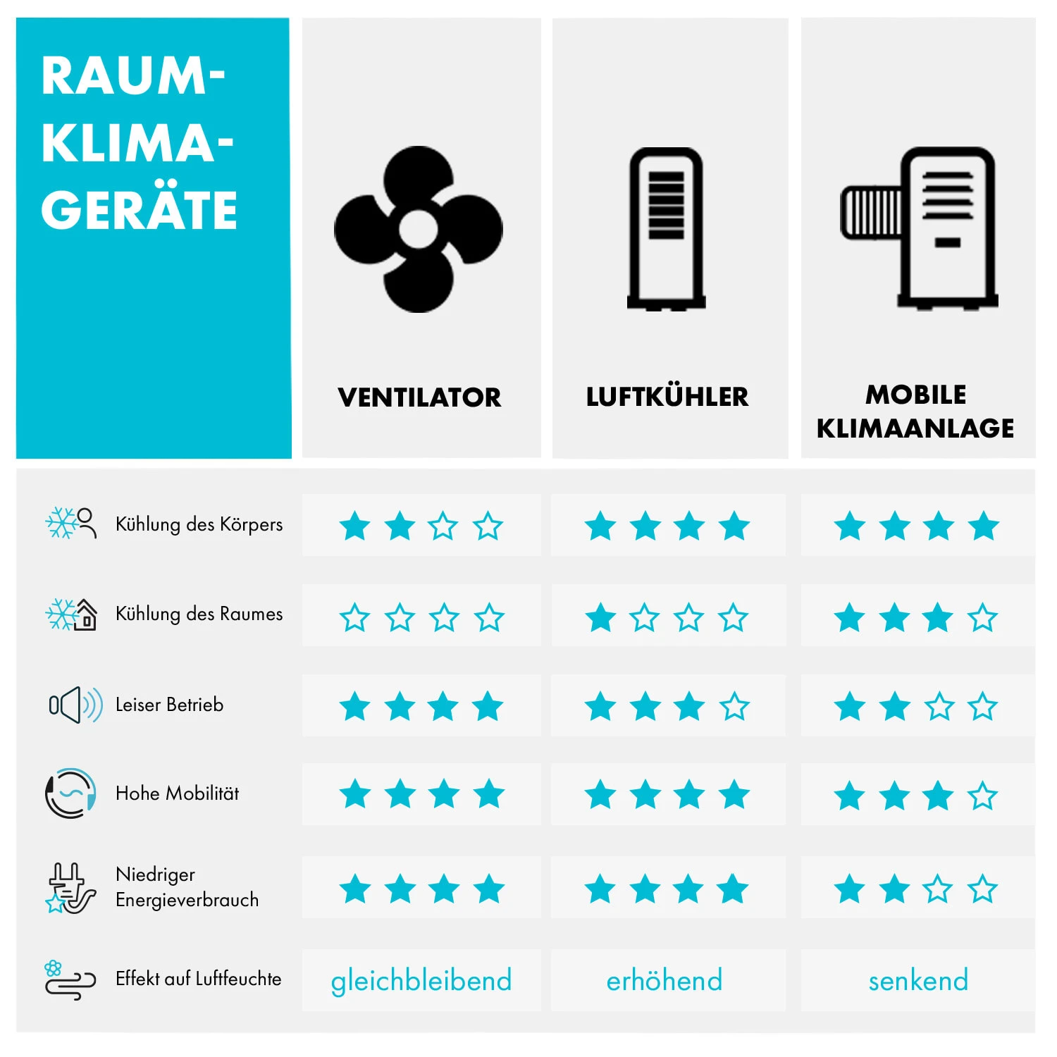 - Evaporationskühler: senkt die Temperatur des Luftstroms