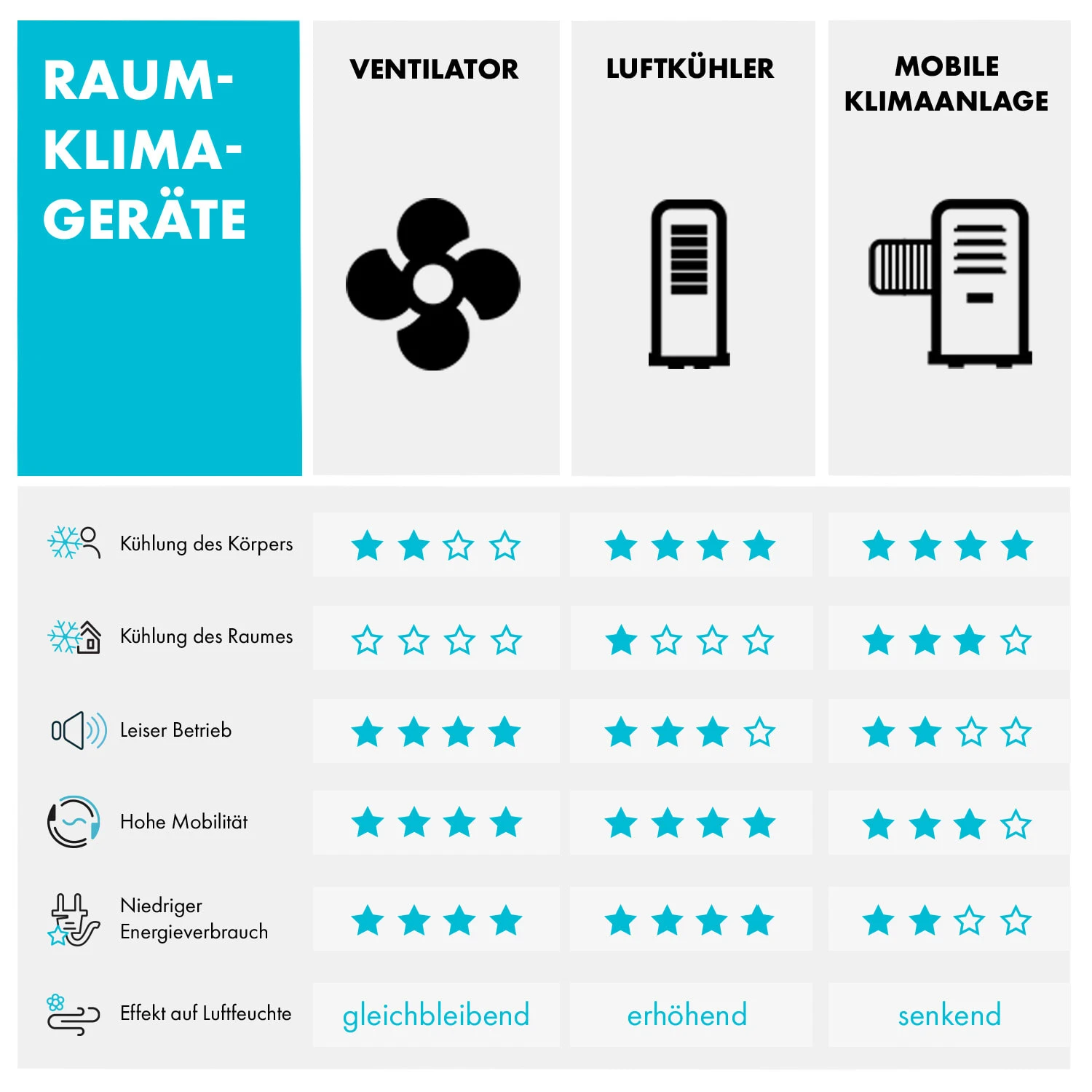 Dabei ist der oneConcept MCH-1 3-in-1 Luftkühler dank seiner vier Bodenrollen voll mobil und begleitet dich umstandslos an jeden Einsatzort – denn die kühle Brise will man immer in seiner Nähe haben. Sein geringer Stromverbrauch von nur 65 Watt und sein rein physikalisches Kühlprinzip machen ihn dabei nicht nur sparsam, sondern auch umweltfreundlich.