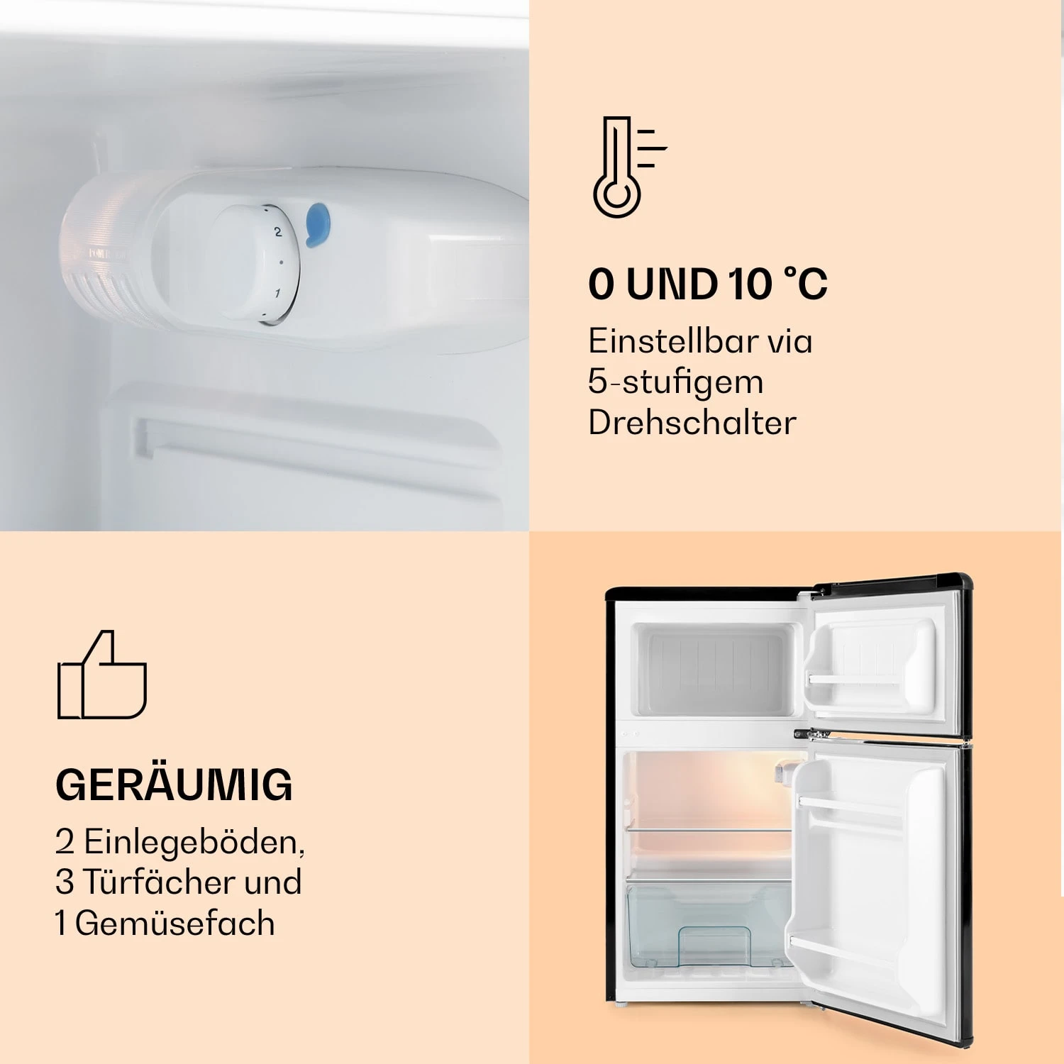 Flashback in der Küche! Mit der Klarstein Monroe Kühl- und Gefrierkombination kehrt das Flair der 50er Jahre zurück, um ganz lässig deine Kühlware frisch zu halten. Mit 61 Litern Stauraum, zwei Glasablagen und zwei Türfächern im Kühl- und 24 Litern Volumen im Gefrierteil steht genügend Platz für Lebensmittel bereit. Via 5-stufigem Drehregler lässt sich eine Temperatur zwischen 0 und 10 °C einstellen. Natürlich verfügt der Monroe über eine Innenbeleuchtung und höhenverstellbare Füße.