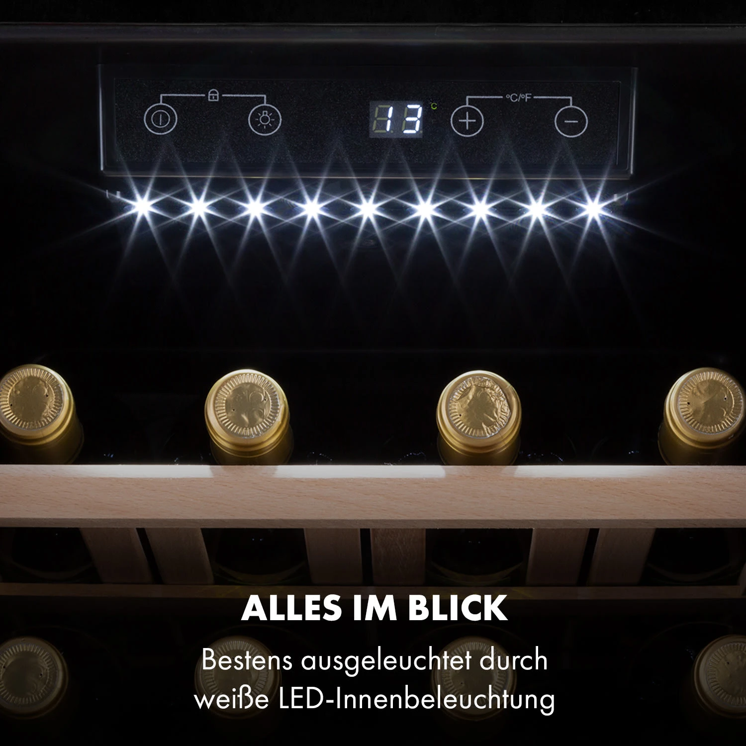 Ob vollmundiger Rotwein, spritziger Weißer oder frischer Rosé: Aus dem stilvollen Vinetage 19 Uno Weinlagerschrank schmecken Weine besonders gut! Auf vier Lagerebenen mit drei herausziehbaren Holzböden finden alle Flaschen übersichtlich ihren Platz. Wähle mit Hilfe des Touch-Panels eine Trinktemperatur zwischen 4 und 22 °C und genieße wohltemperierten Wein, während deine Vorräte wunderbar hinter der Glastüre inszeniert werden – angestrahlt durch die weiße LED-Innenbeleuchtung.